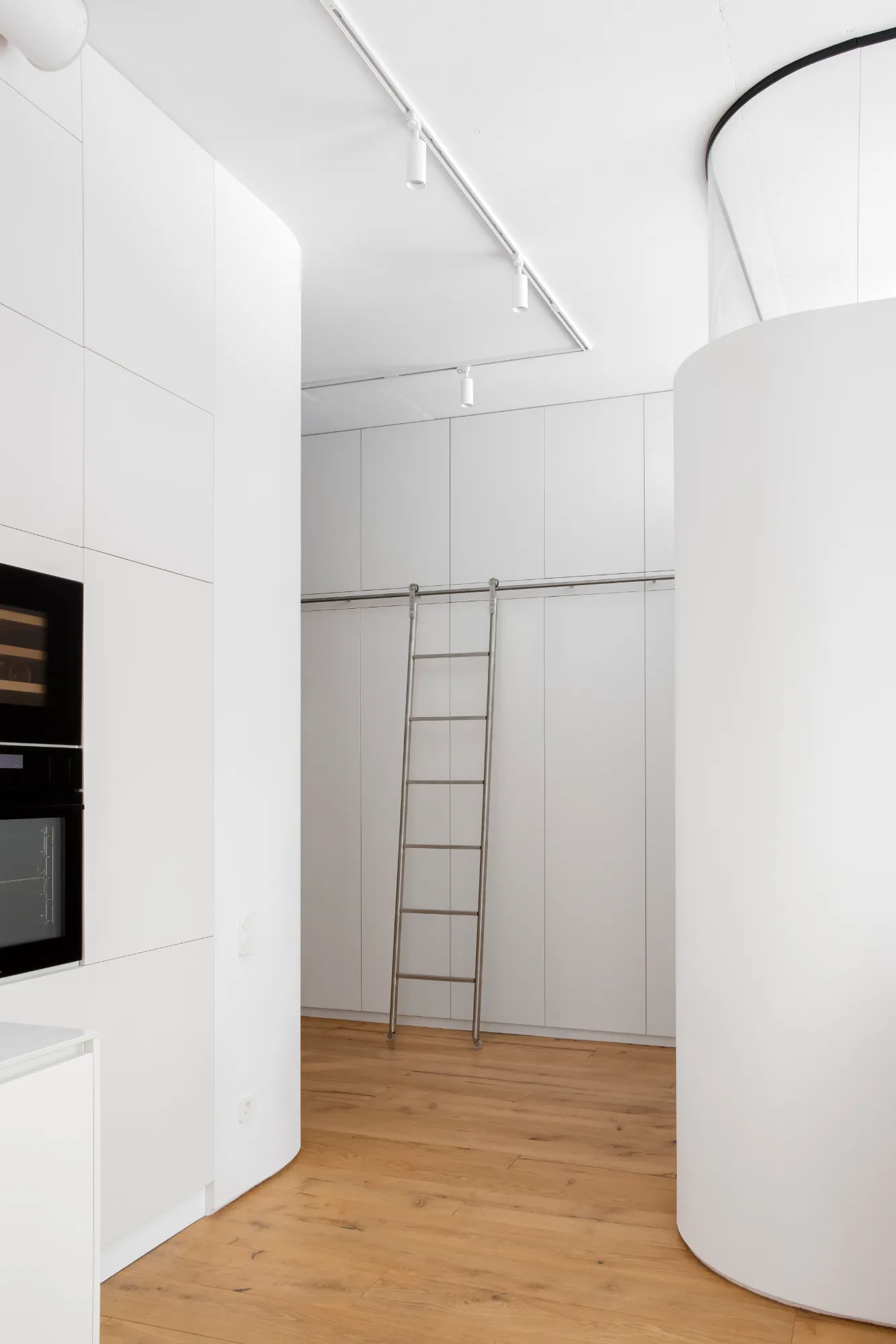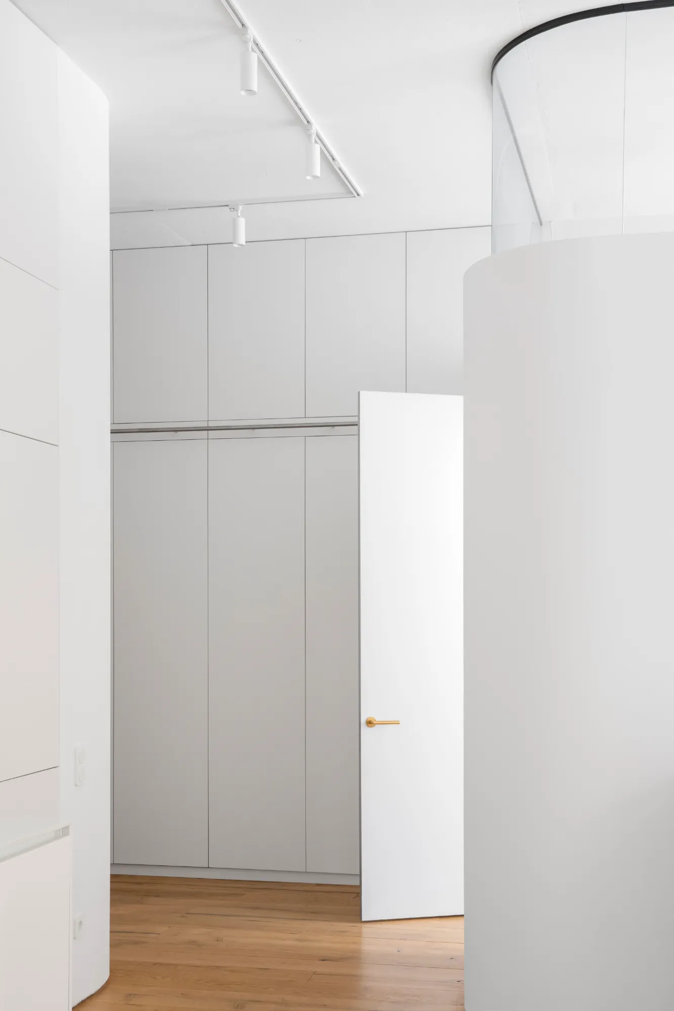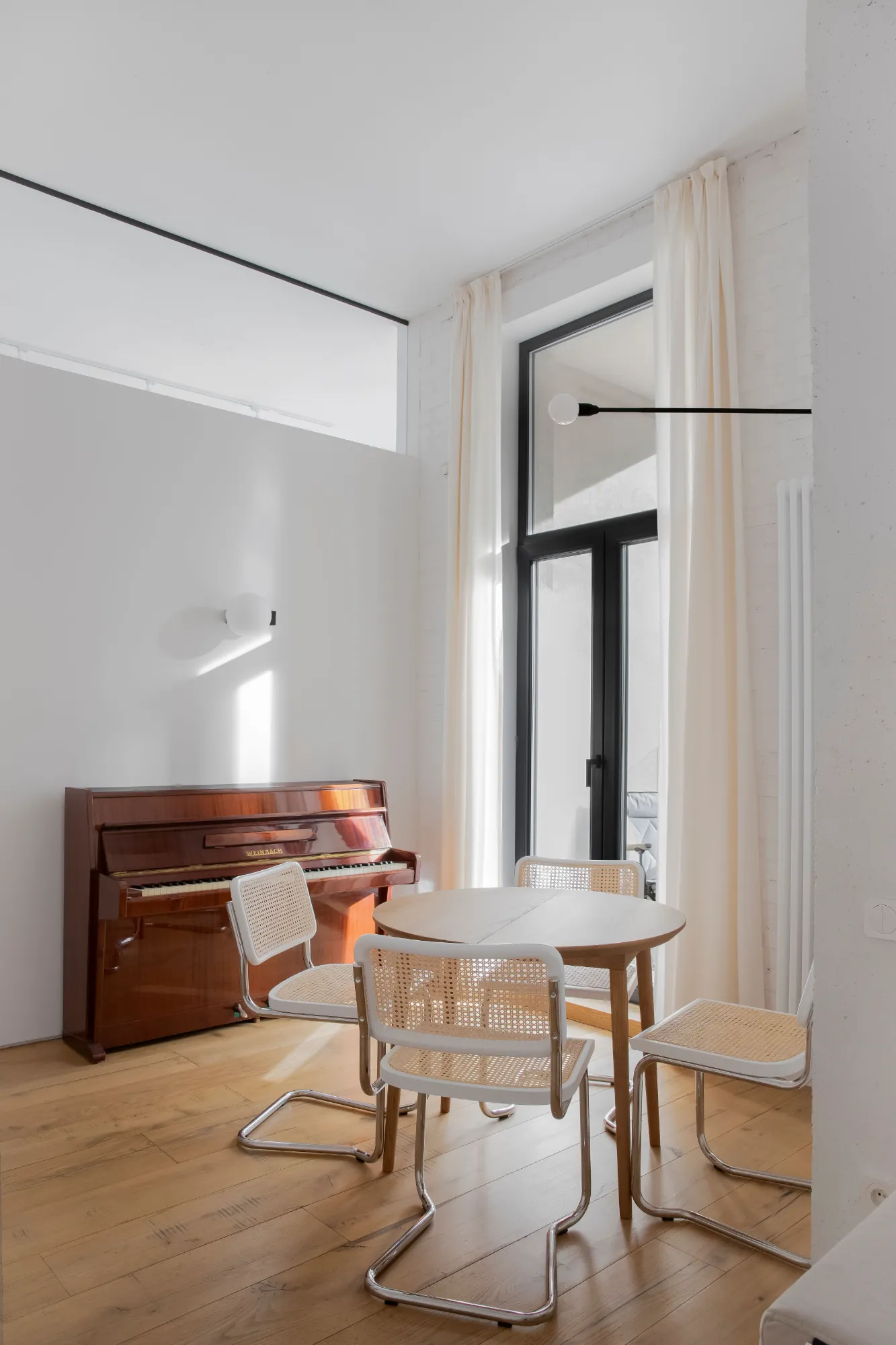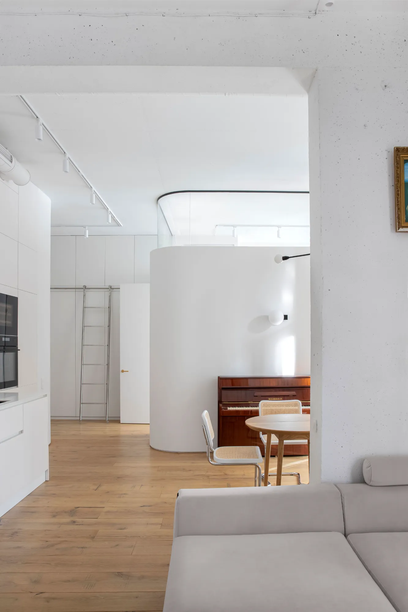 Серцем квартири стало поєднання гостьової з круглим столом і піаніно. Висота стелі 3,6 м збережена, крім ванної кімнати, де стелю знижено. Інтегровані системи очищення та кондиціонування повітря. Для зберігання у високих зонах використовується рухома драбина з нержавіючої сталі. Ванна кімната — нейтральна, з мікроцементу. Всі додаткові елементи - з латуні. Головна деталь — зігнуте скло в спальні під стелею, що об’єднує зони входу, вітальні та дитячої. Зручності додають згладжені кути, що підкреслюють висоту простору.
