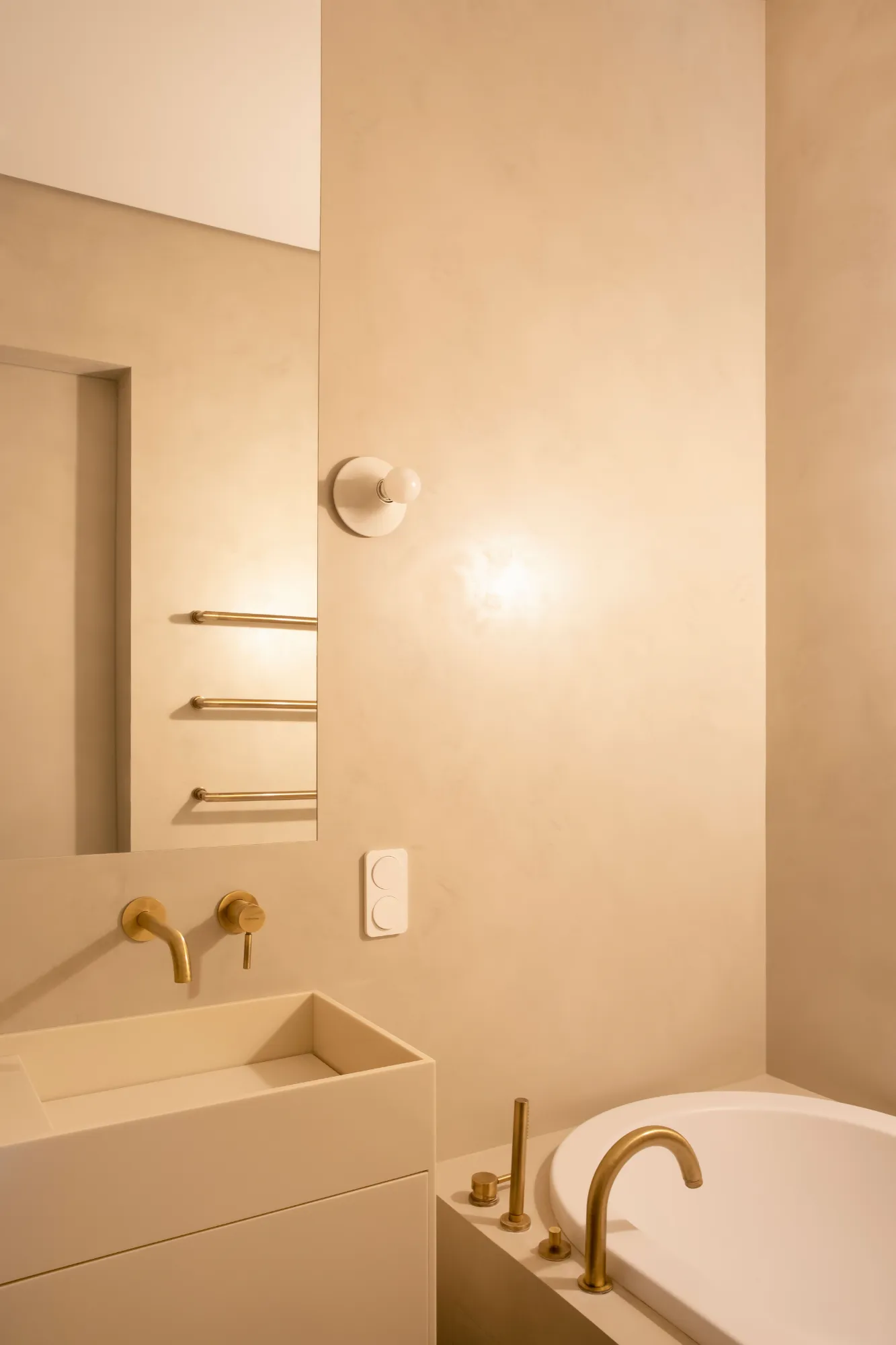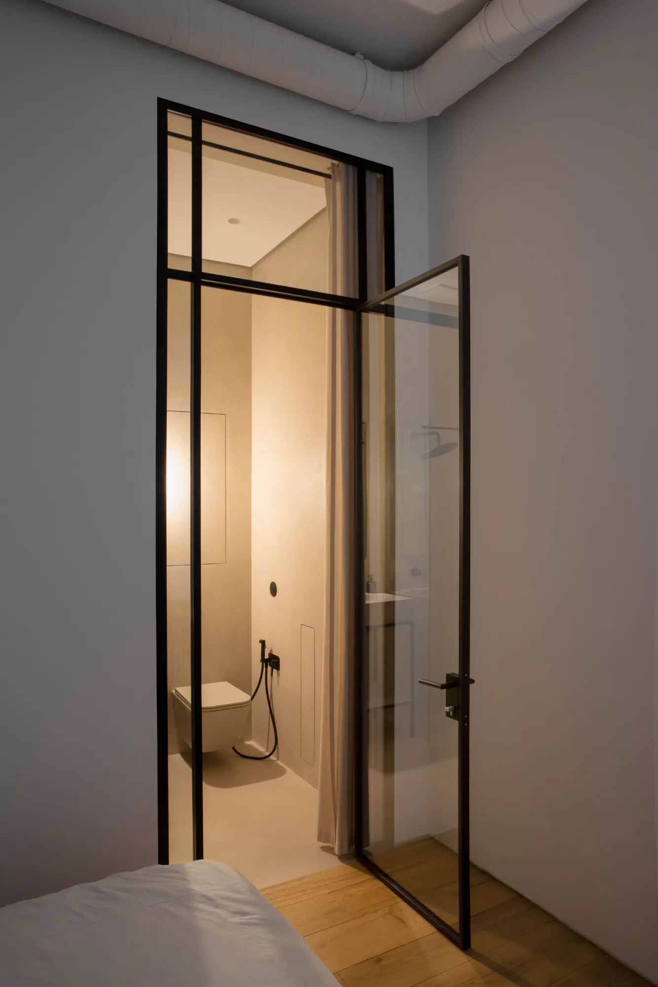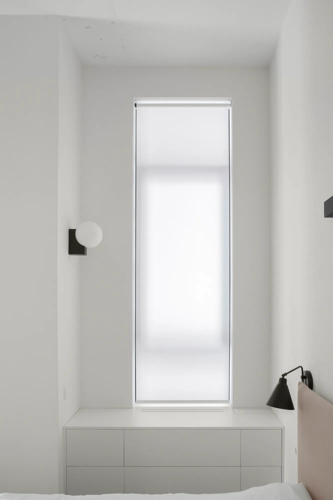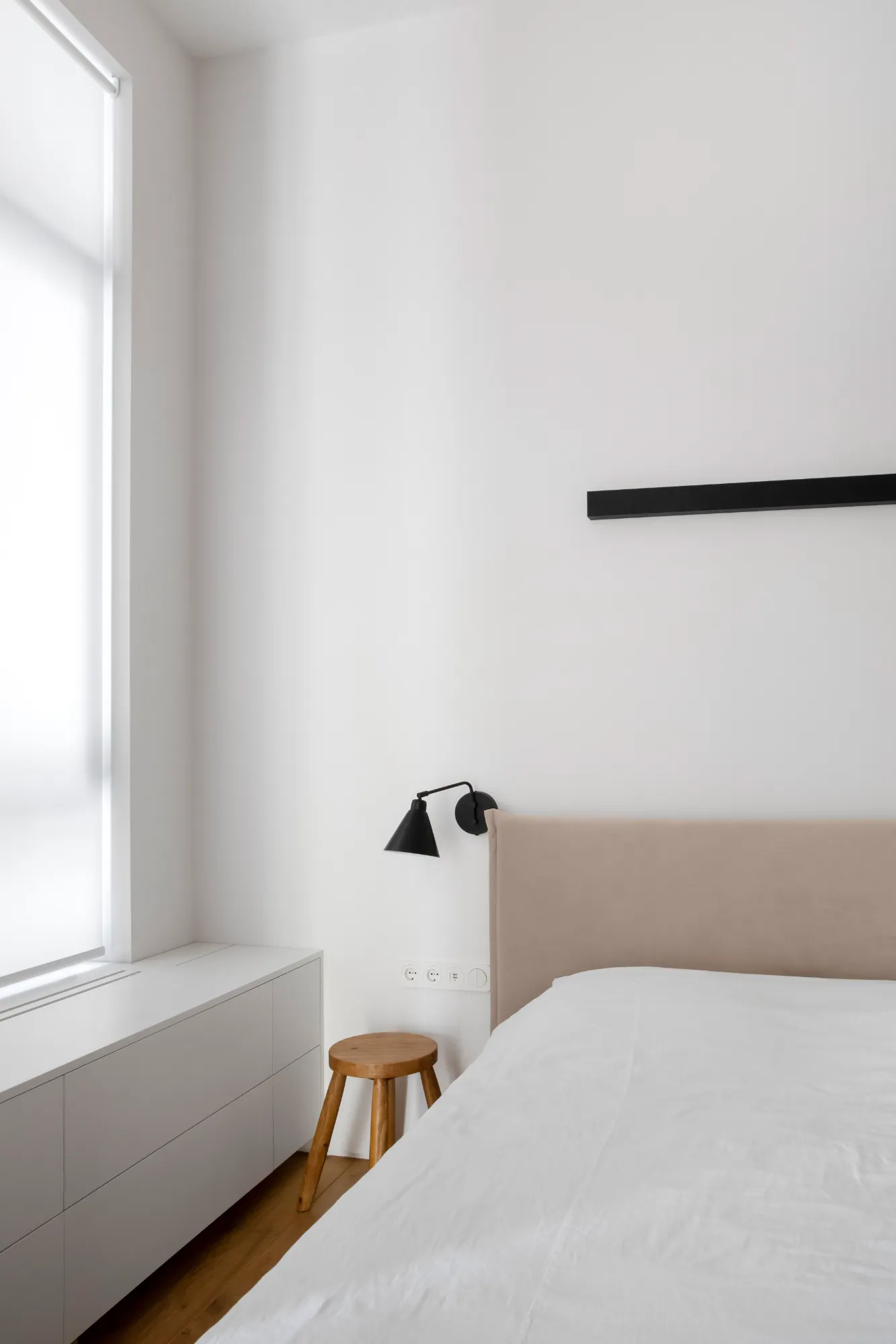 Серцем квартири стало поєднання гостьової з круглим столом і піаніно. Висота стелі 3,6 м збережена, крім ванної кімнати, де стелю знижено. Інтегровані системи очищення та кондиціонування повітря. Для зберігання у високих зонах використовується рухома драбина з нержавіючої сталі. Ванна кімната — нейтральна, з мікроцементу. Всі додаткові елементи - з латуні. Головна деталь — зігнуте скло в спальні під стелею, що об’єднує зони входу, вітальні та дитячої. Зручності додають згладжені кути, що підкреслюють висоту простору.
