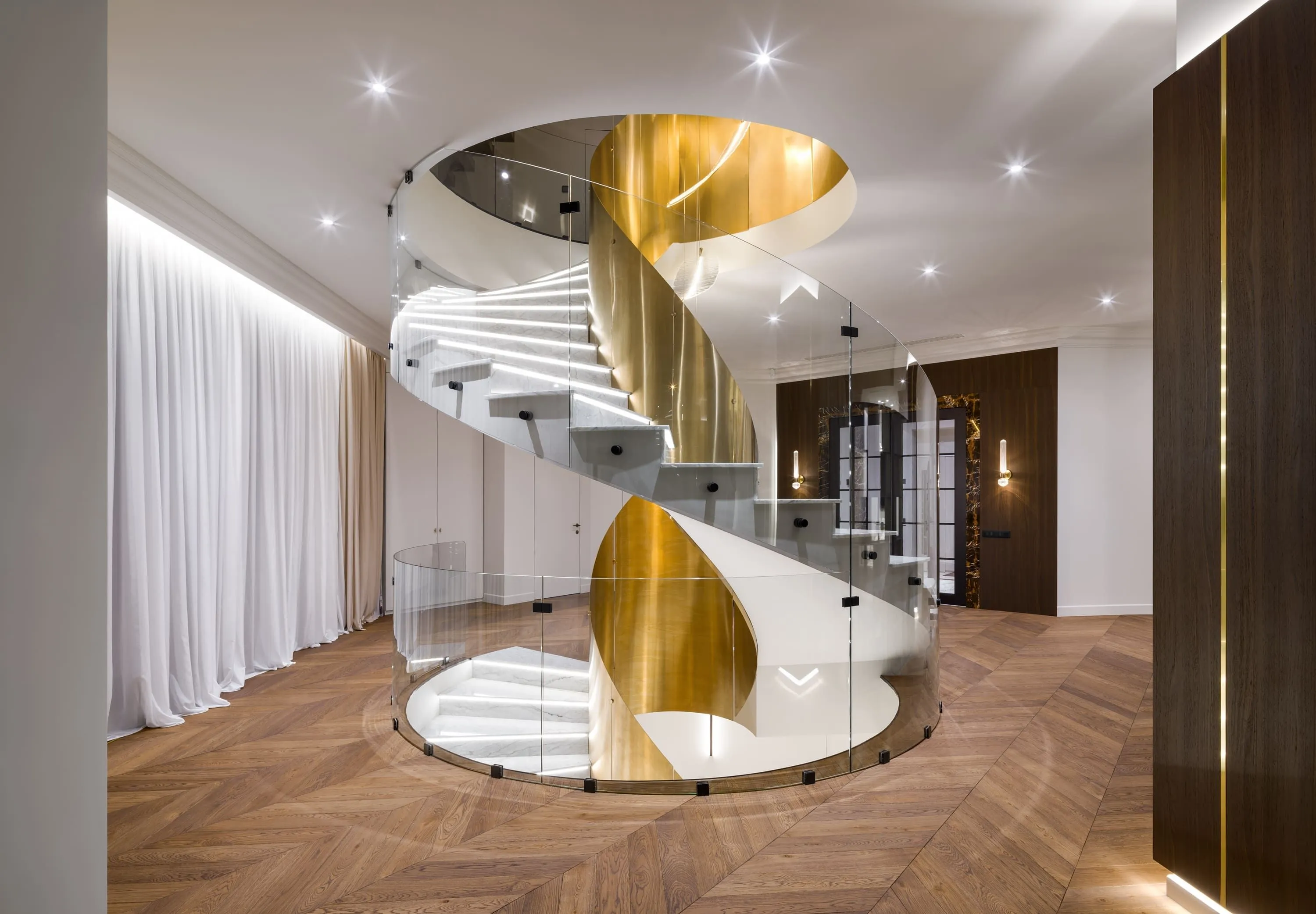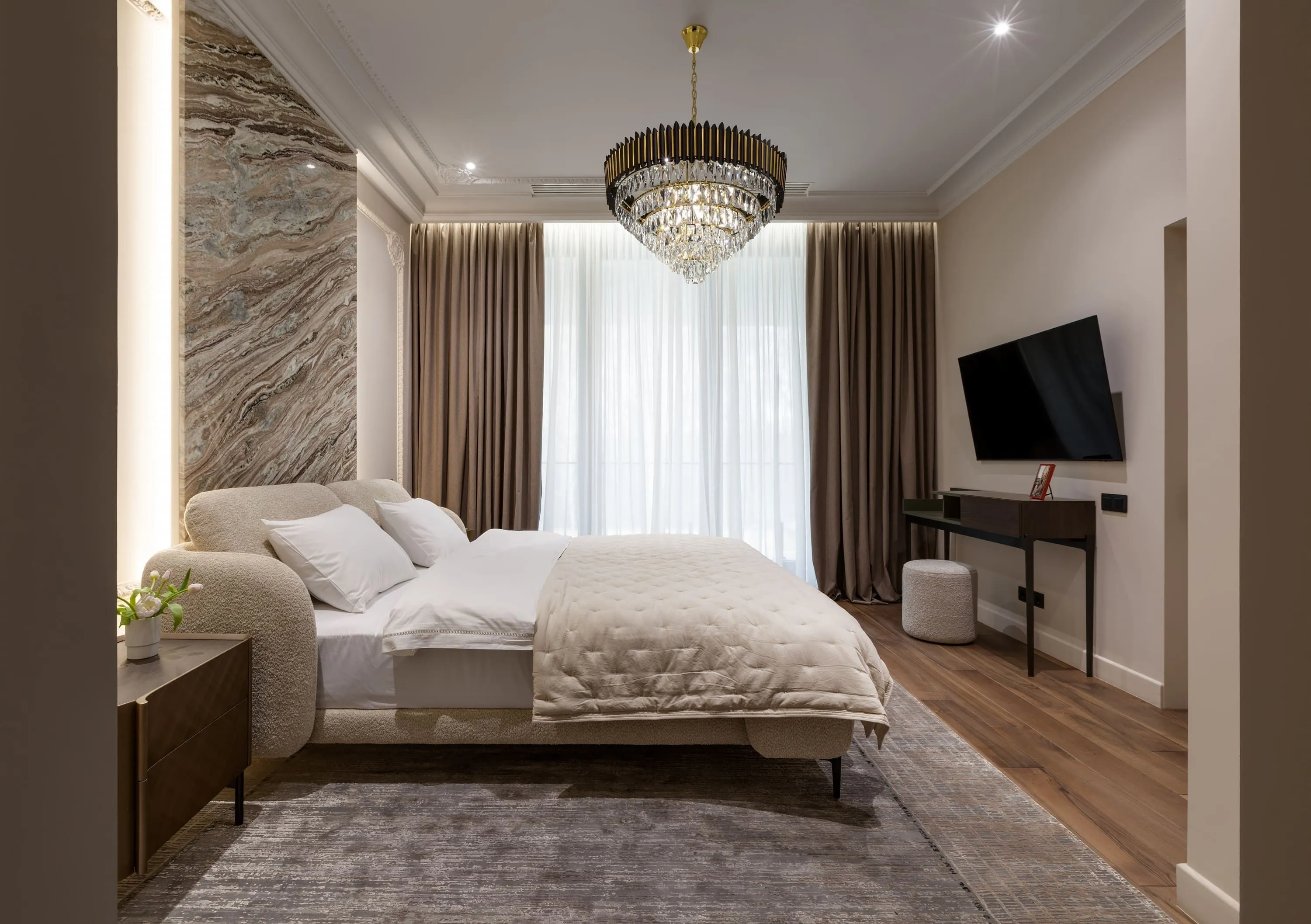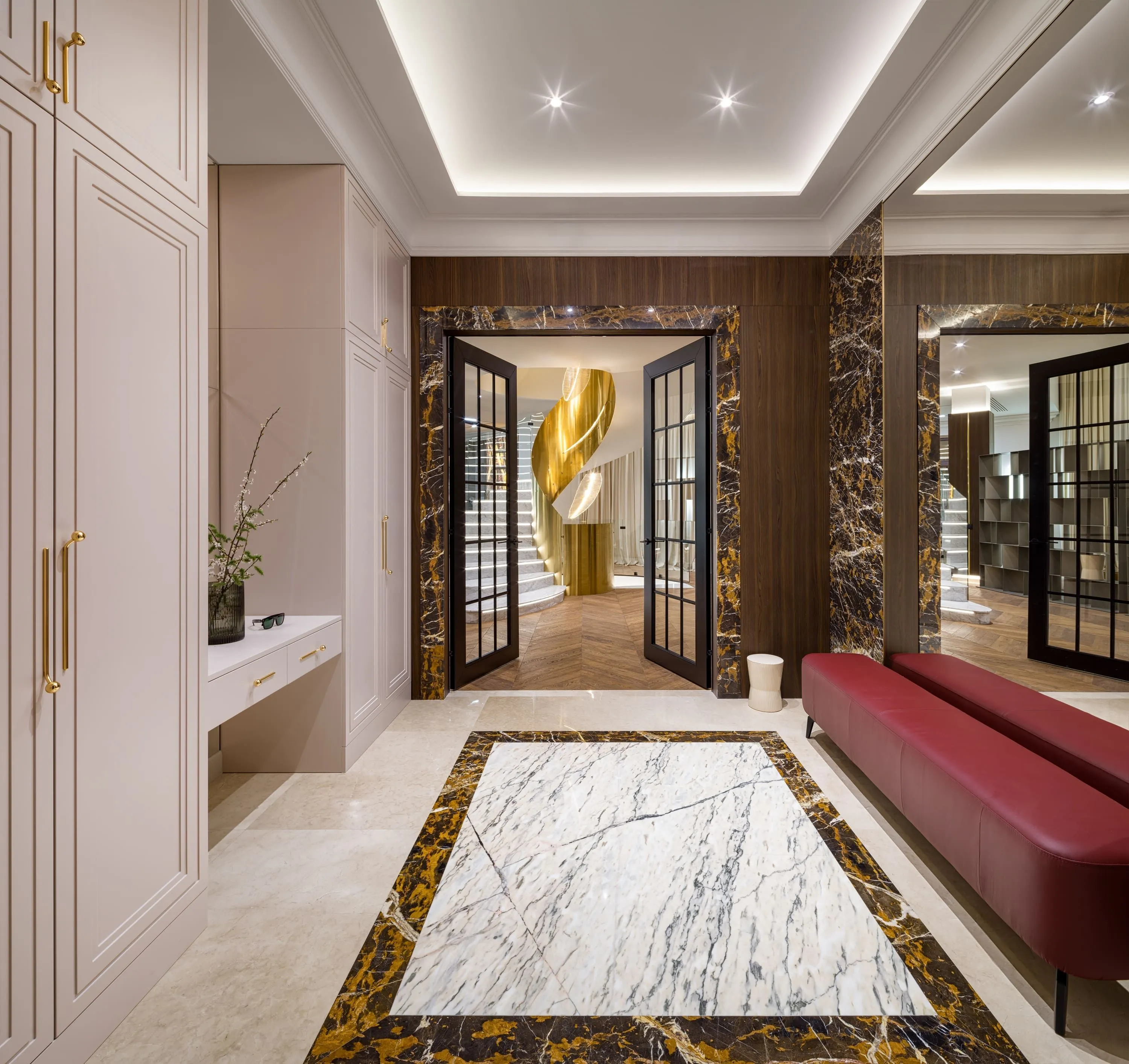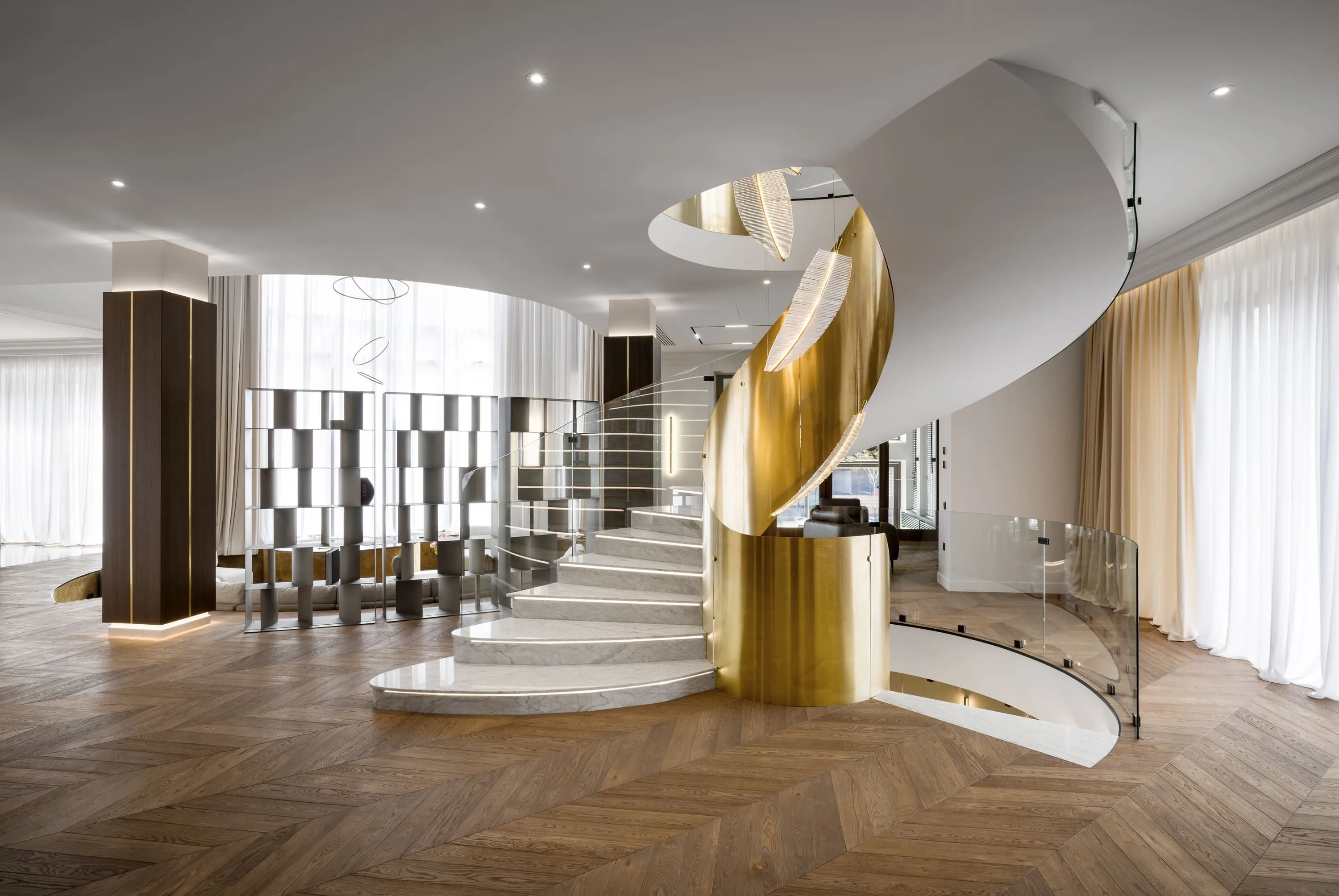 Інтер’єр виконаний у сучасному стилі з елементами мінімалізму та класичної елегантності. Базова палітра — теплі натуральні тони: білий, бежевий, сірий, глибокі деревні відтінки, акценти каменю та скла. У матеріалах — шпон, камінь, матові та глянцеві метали, натуральне дерево. Вбудовані меблі — індивідуального виробництва, окремо розташовані меблі від преміальних брендів, що підкреслюють стиль та простір. Високоякісний текстиль, підібраний з урахуванням відтінків, фактур та структур. Освітлення багаторівневе, з інтегрованими системами та декоративними світильниками, що формують характер кожної зони. Усі деталі, від дверних ручок до швів на оббивці, ретельно продумані та інтегровані в загальний простір.fdnjhb