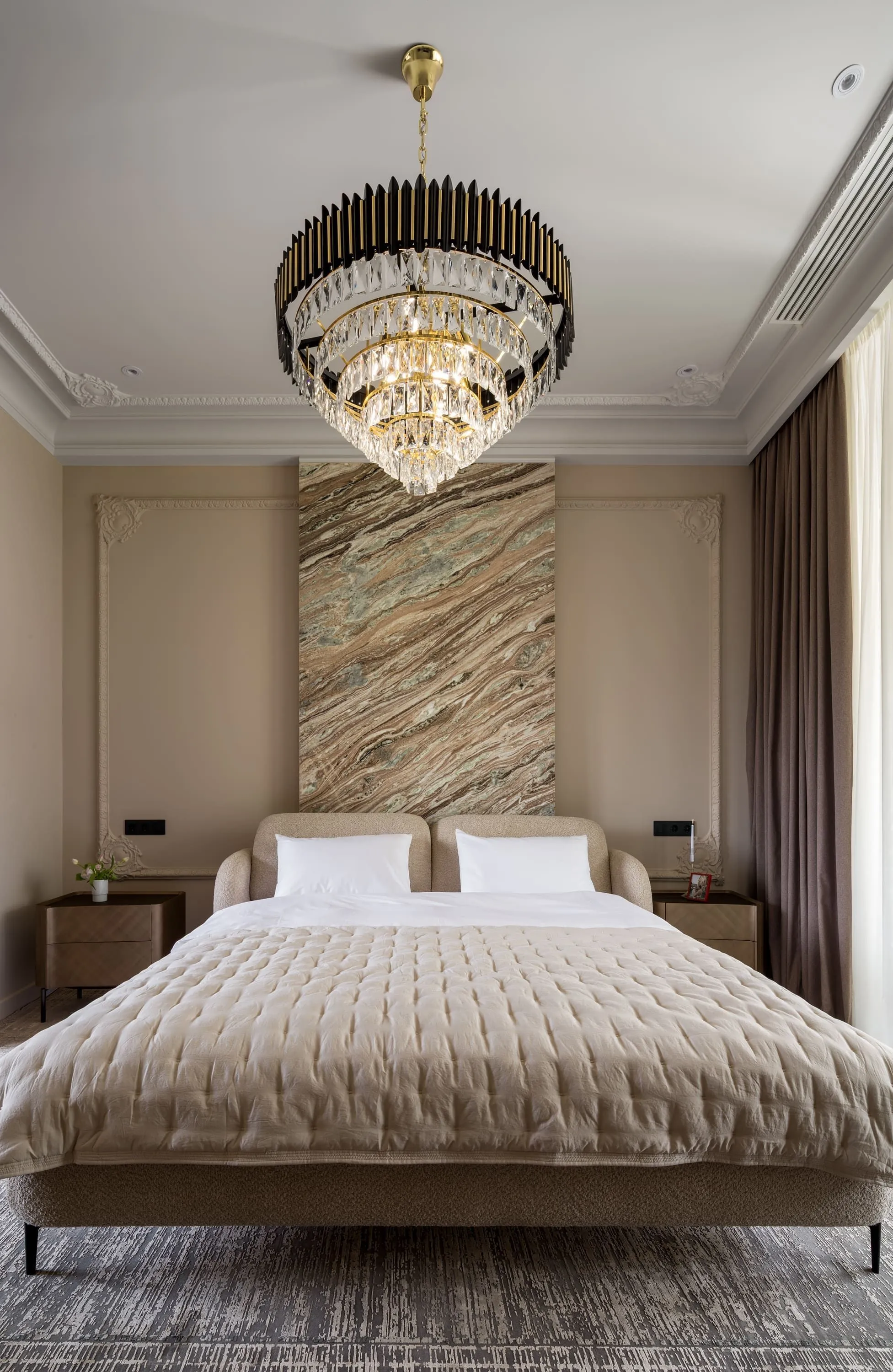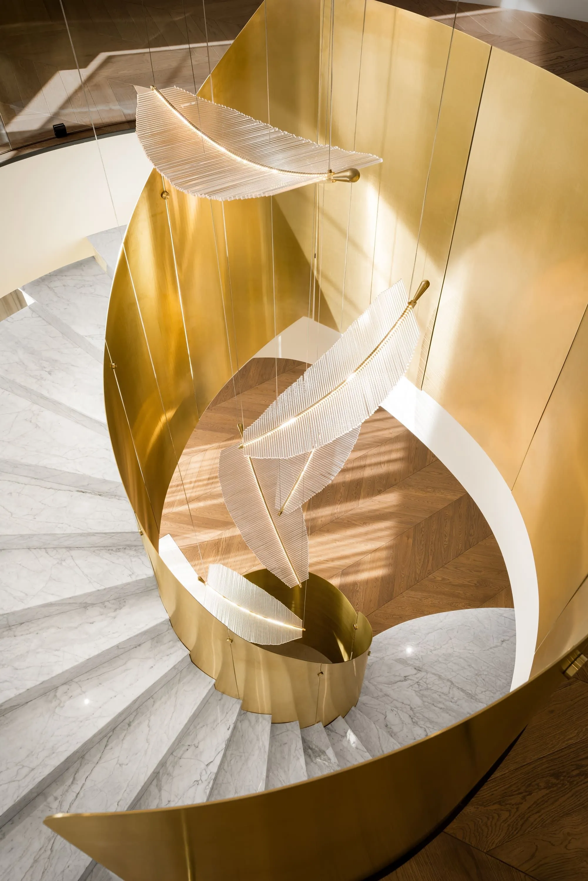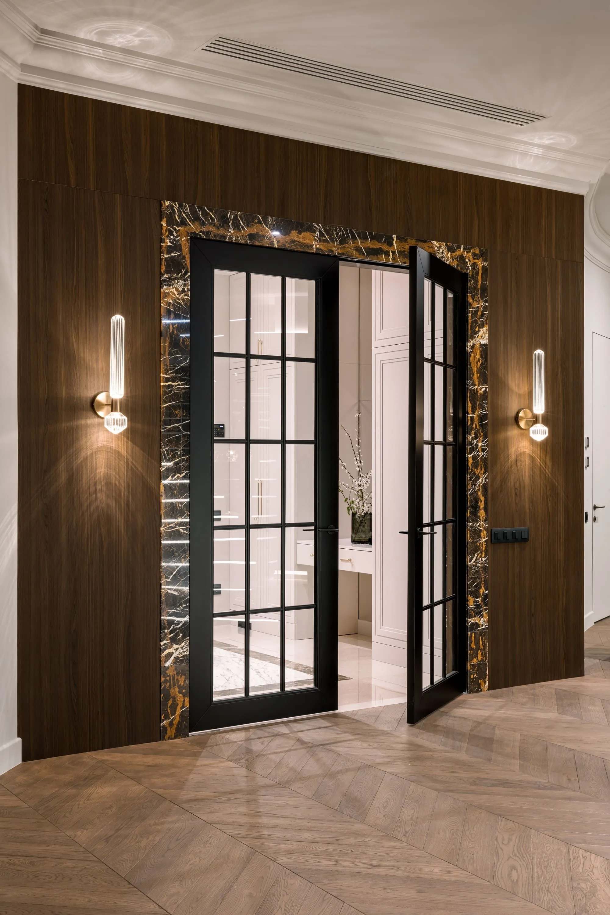 Інтер’єр виконаний у сучасному стилі з елементами мінімалізму та класичної елегантності. Базова палітра — теплі натуральні тони: білий, бежевий, сірий, глибокі деревні відтінки, акценти каменю та скла. У матеріалах — шпон, камінь, матові та глянцеві метали, натуральне дерево. Вбудовані меблі — індивідуального виробництва, окремо розташовані меблі від преміальних брендів, що підкреслюють стиль та простір. Високоякісний текстиль, підібраний з урахуванням відтінків, фактур та структур. Освітлення багаторівневе, з інтегрованими системами та декоративними світильниками, що формують характер кожної зони. Усі деталі, від дверних ручок до швів на оббивці, ретельно продумані та інтегровані в загальний простір.fdnjhb