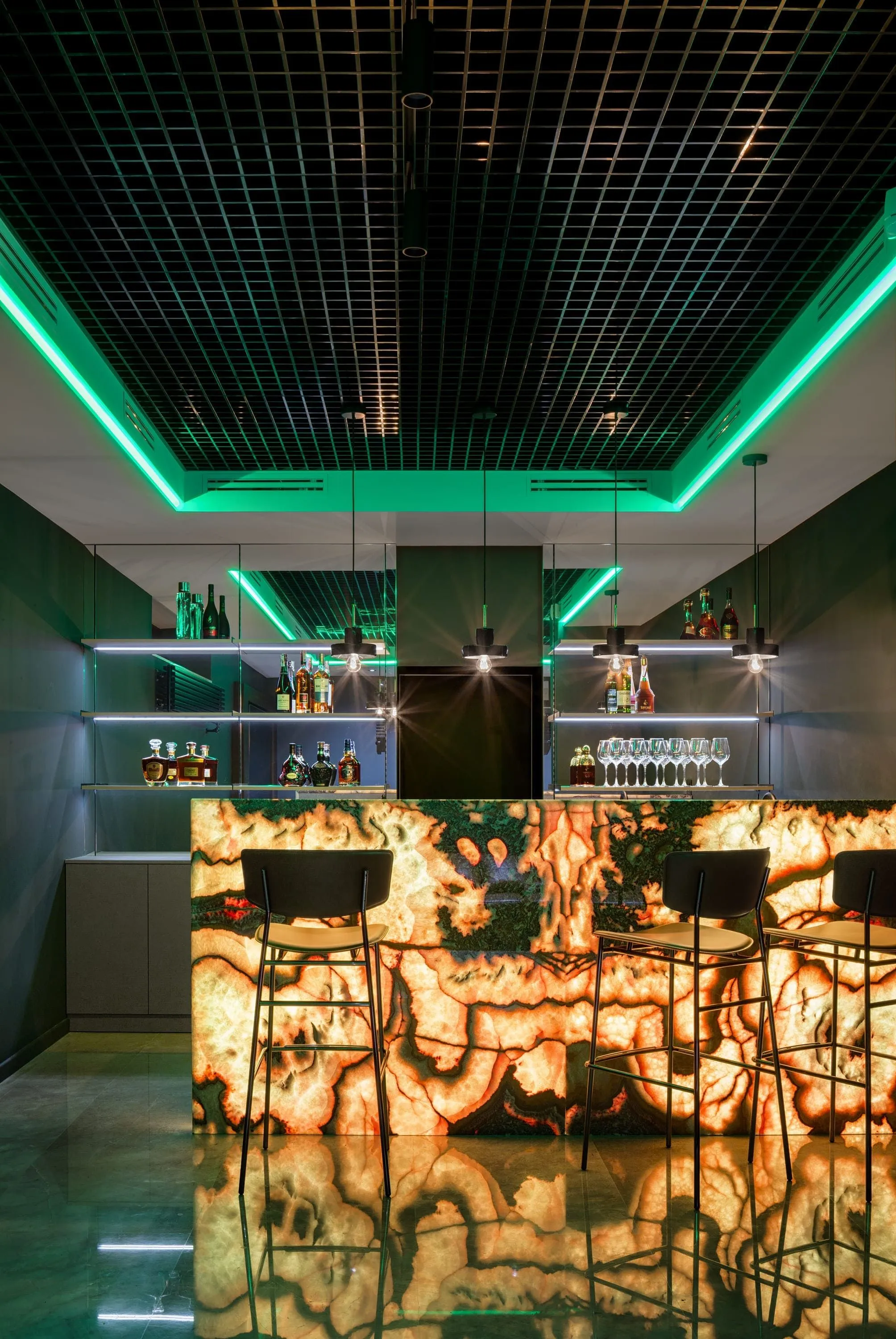 Цей будинок став втіленням ідеї приватного відновлення. Однією з виразних особливостей стали центральні сходи та кругові маршрути пересування, що підсилюють відчуття плавного, безперервного руху. Проєкт також вирізняється унікальним підходом до організації простору. Однією з цікавих деталей стало використання фарби, що змінює свій відтінок залежно від освітлення та пори року. Ще однією особливістю стали дизайнерські елементи з природних матеріалів, таких як паркетна дошка, стінові панелі та полірований камінь, що відображають унікальність природи, створюючи враження безперервного контакту з навколишнім середовищем. Одним із головних викликів стало інтегрування складних технічних рішень у чисту дизайнерську концепцію. Завдяки злагодженій роботі команди та професійних підрядників вдалося створити приховану, але ефективну інженерію, що не порушує естетичної гармонії. Результат — вишуканий, продуманий та технологічно досконалий простір, у якому легко дихається й приємно жити.