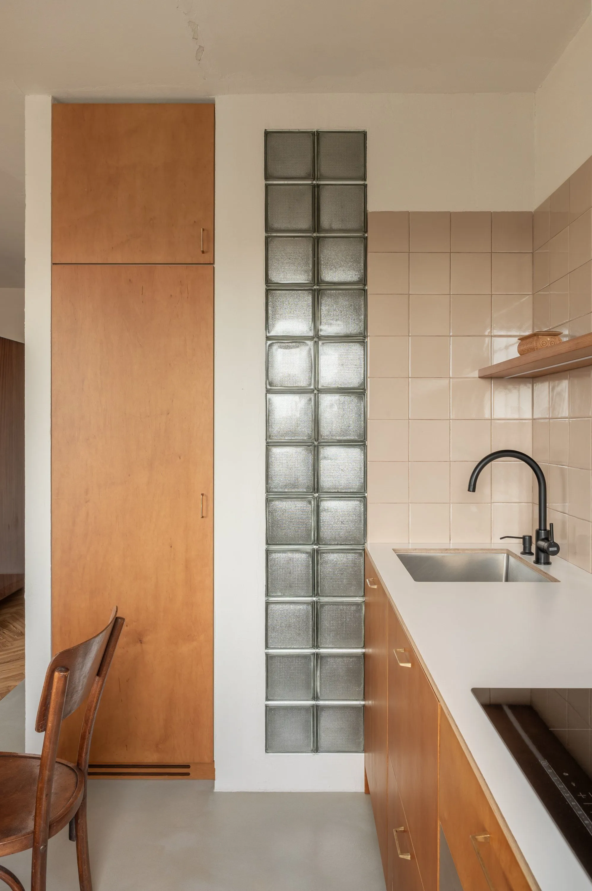 Зі створеного у квартирі лише кухня й ліжко, проте вони служать для простору, а не їхня новизна є центром оточення. Аби вони виглядали органічно поруч з історичними речима, виконали їх з тонованої березової фанери.