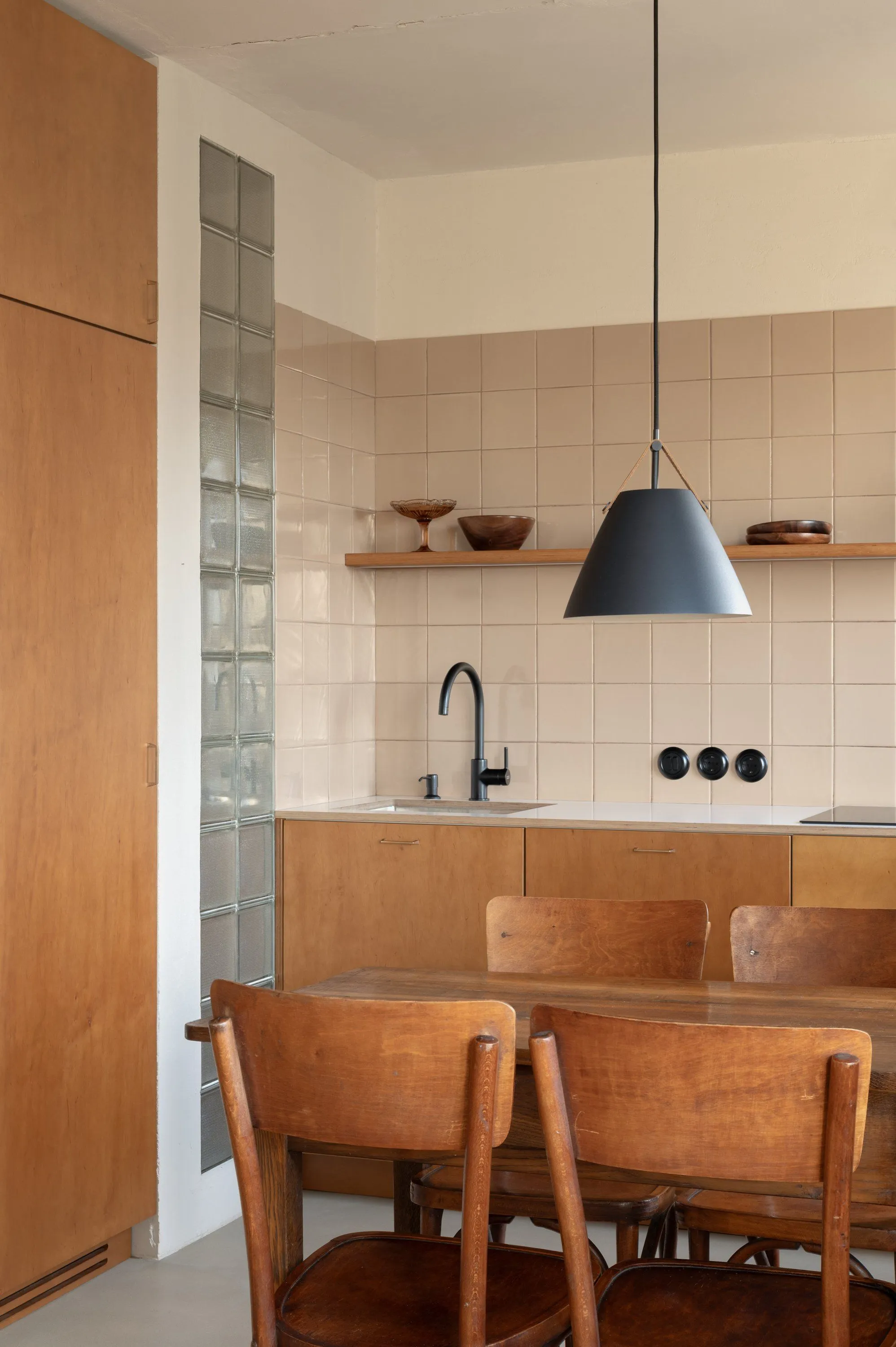 Важливими елементами у квартирі є речі з історією. Наприклад, вживані скляні блоки та керамічну плитку для санвузла й кухні знайдено на ОLX. Дубовий стіл, створений понад 60 років тому, використовувався у родині дизайнерки, а тепер став частиною її помешкання. Довкола нього - старі гнуті дерев’яні стільці.