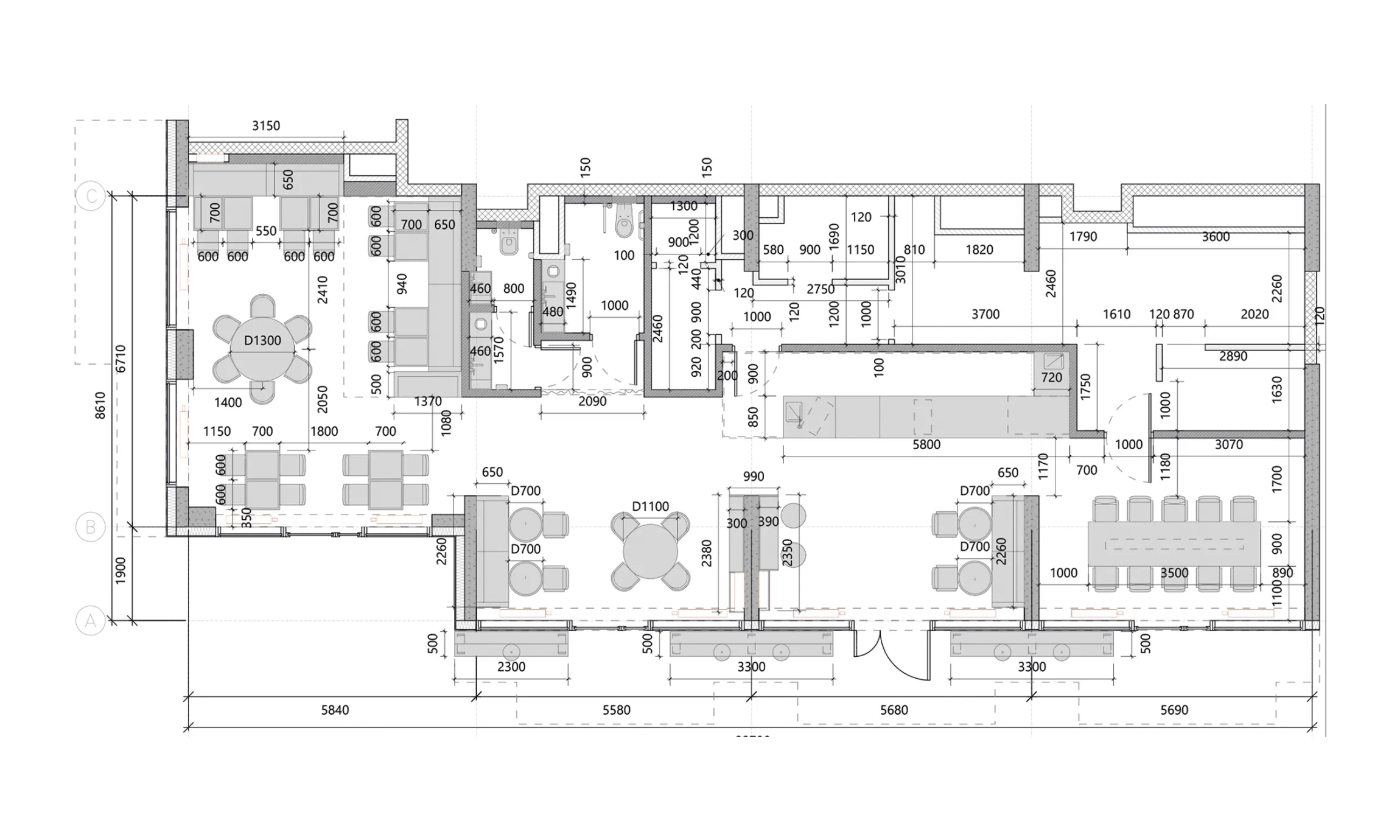 Меблі вирізняються раціональністю та стриманістю. Дерев’яні стільці та столи за тактильно приємного матеріалі травертину з чіткими силуетами підкреслюють демократичний характер простору, зберігаючи архітектурну точність. Планування гнучке: воно дозволяє однаково зручно проводити обідню перерву, працювати за ноутбуком чи збиратися компанією ввечері.