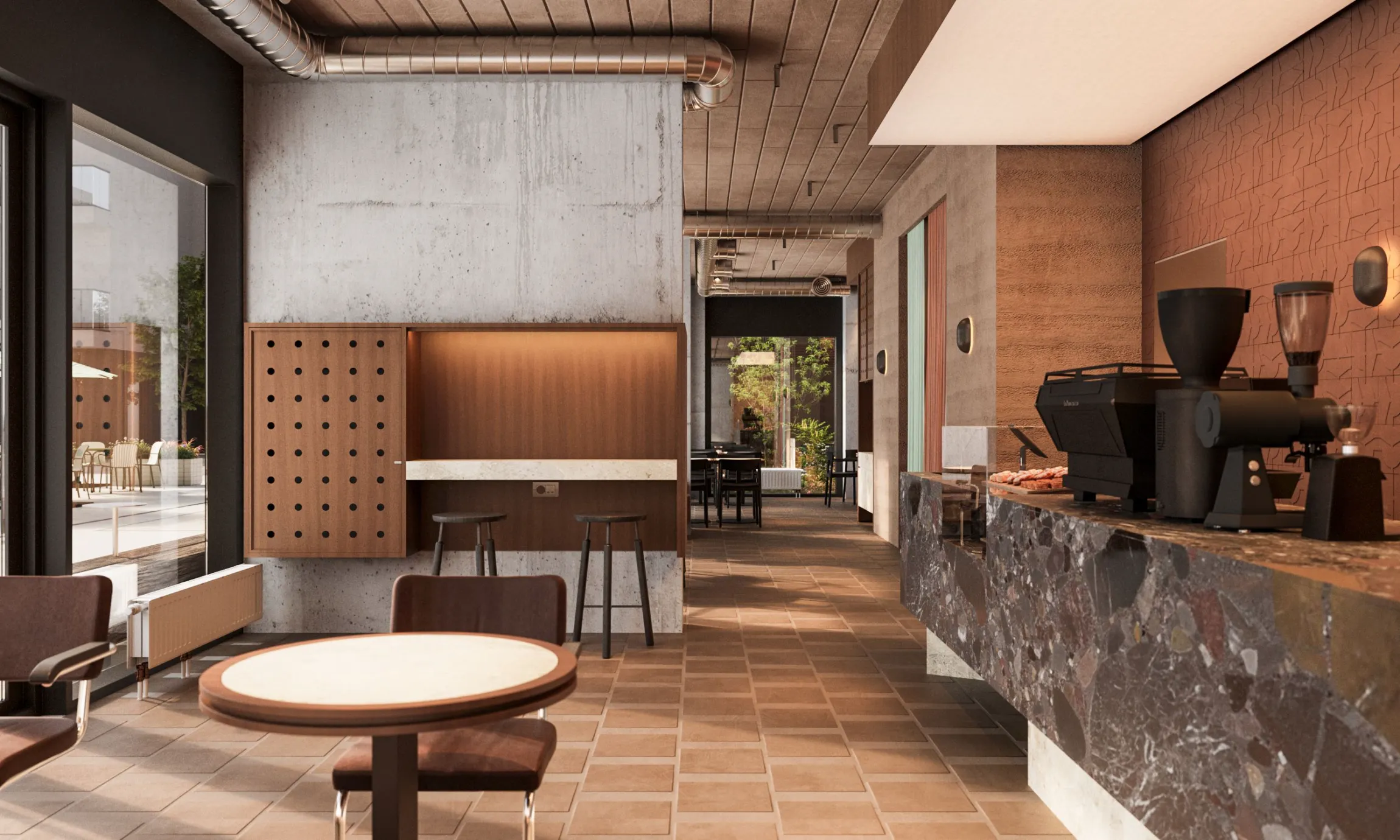 Особливу увагу приділено зонуванню: інтимні куточки та великі спільні столи відображають різноманітний ритм міського життя.
